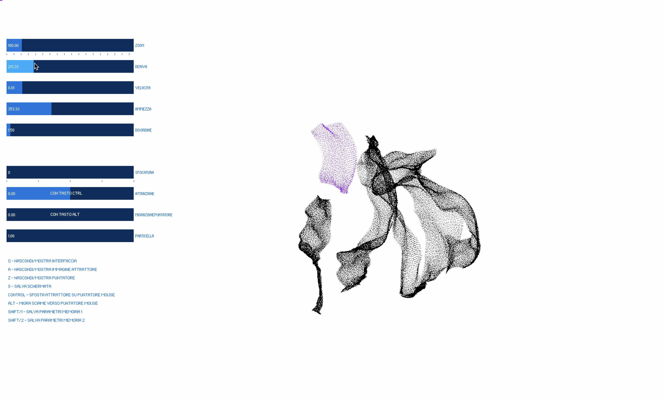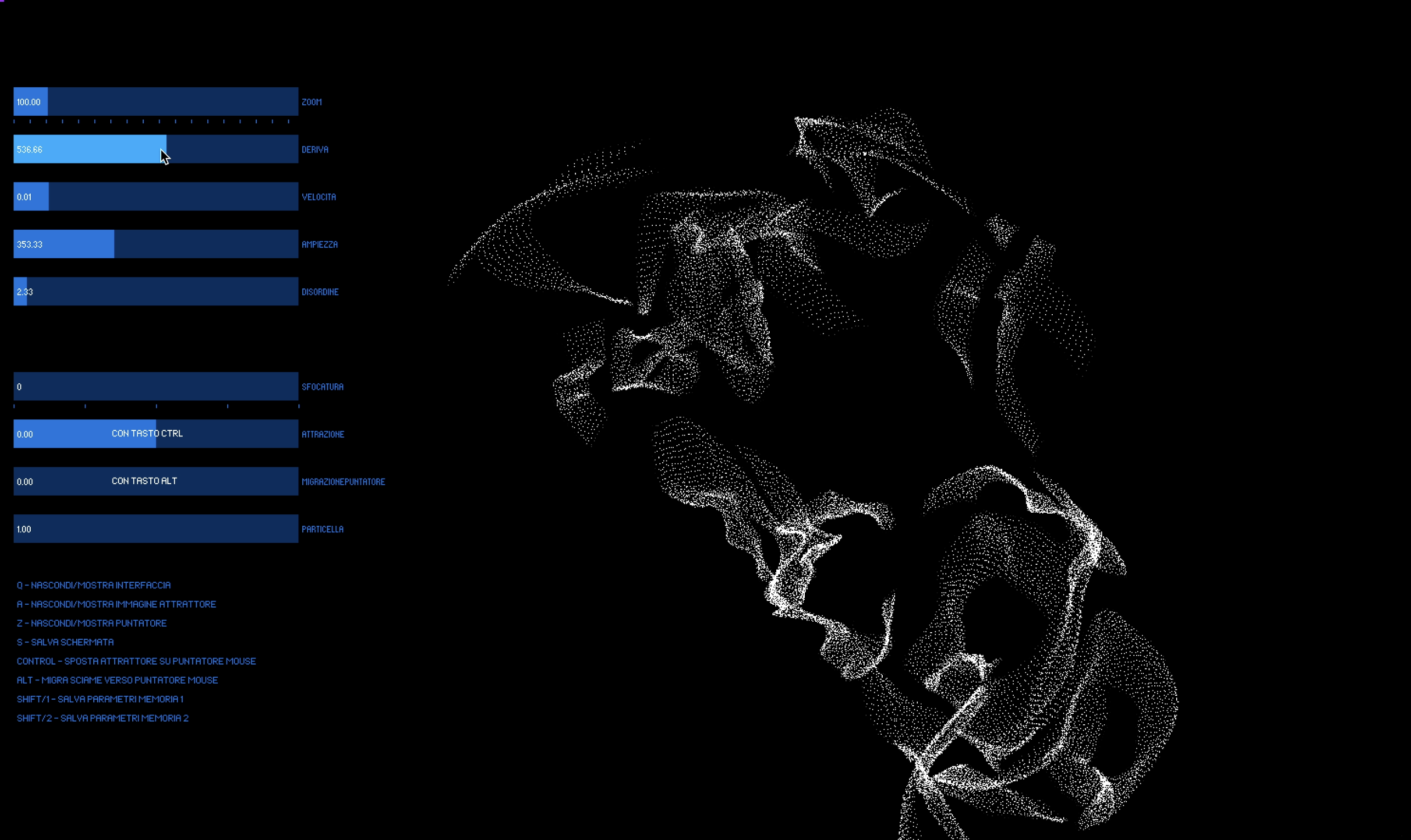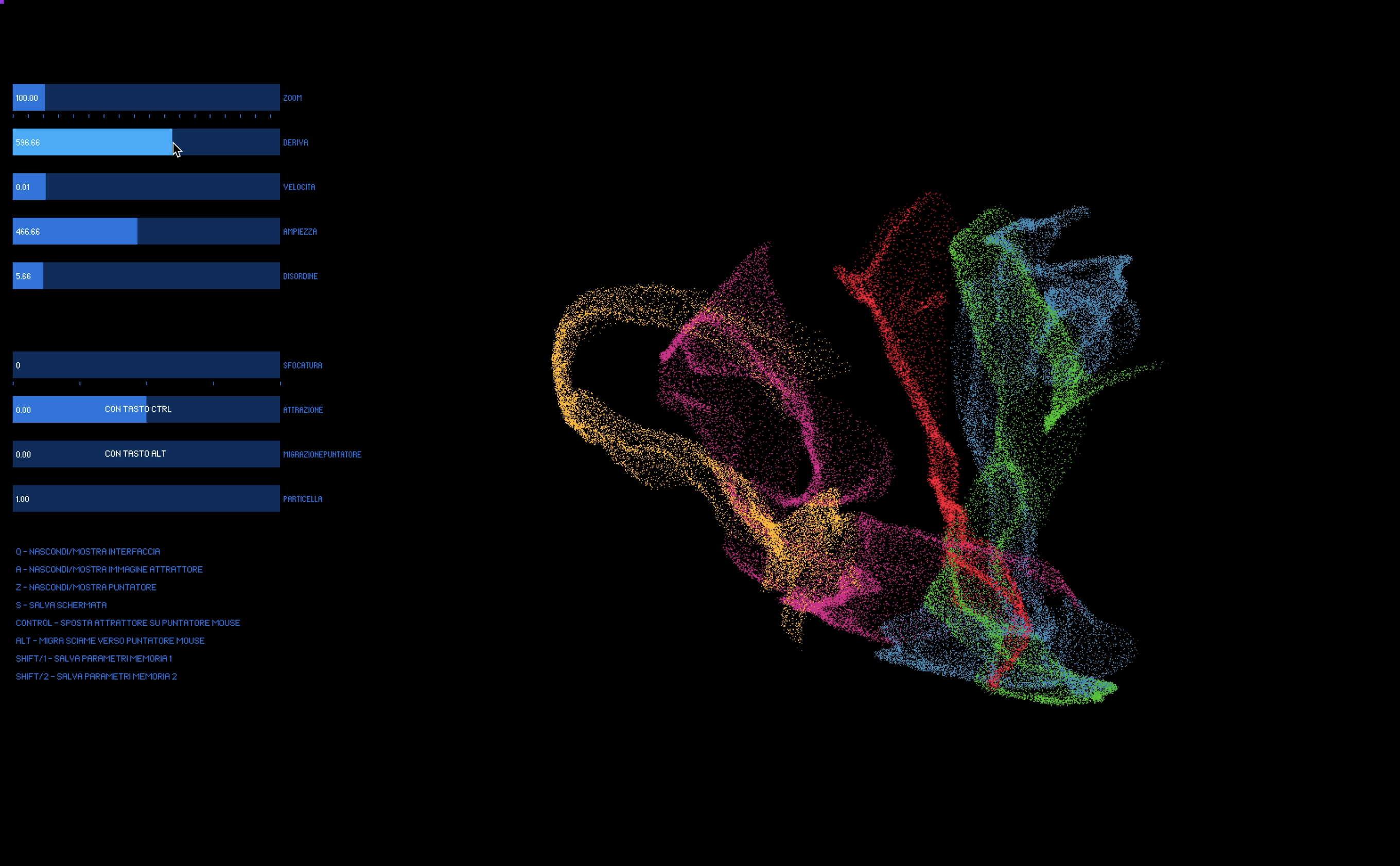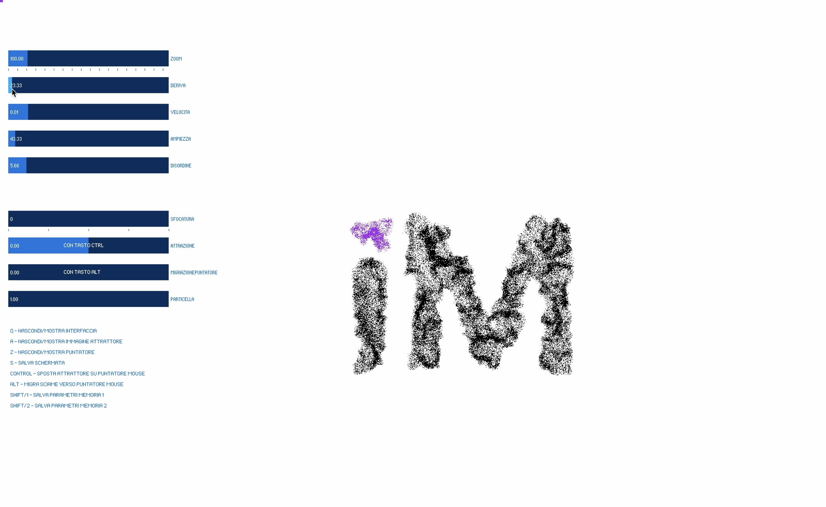 A questo scopo abbiamo realizzato un programma in Processing che genera uno sciame di particelle partendo da qualunque immagine o testo. Lo sciame è modulabile mediante parametri on-screen.